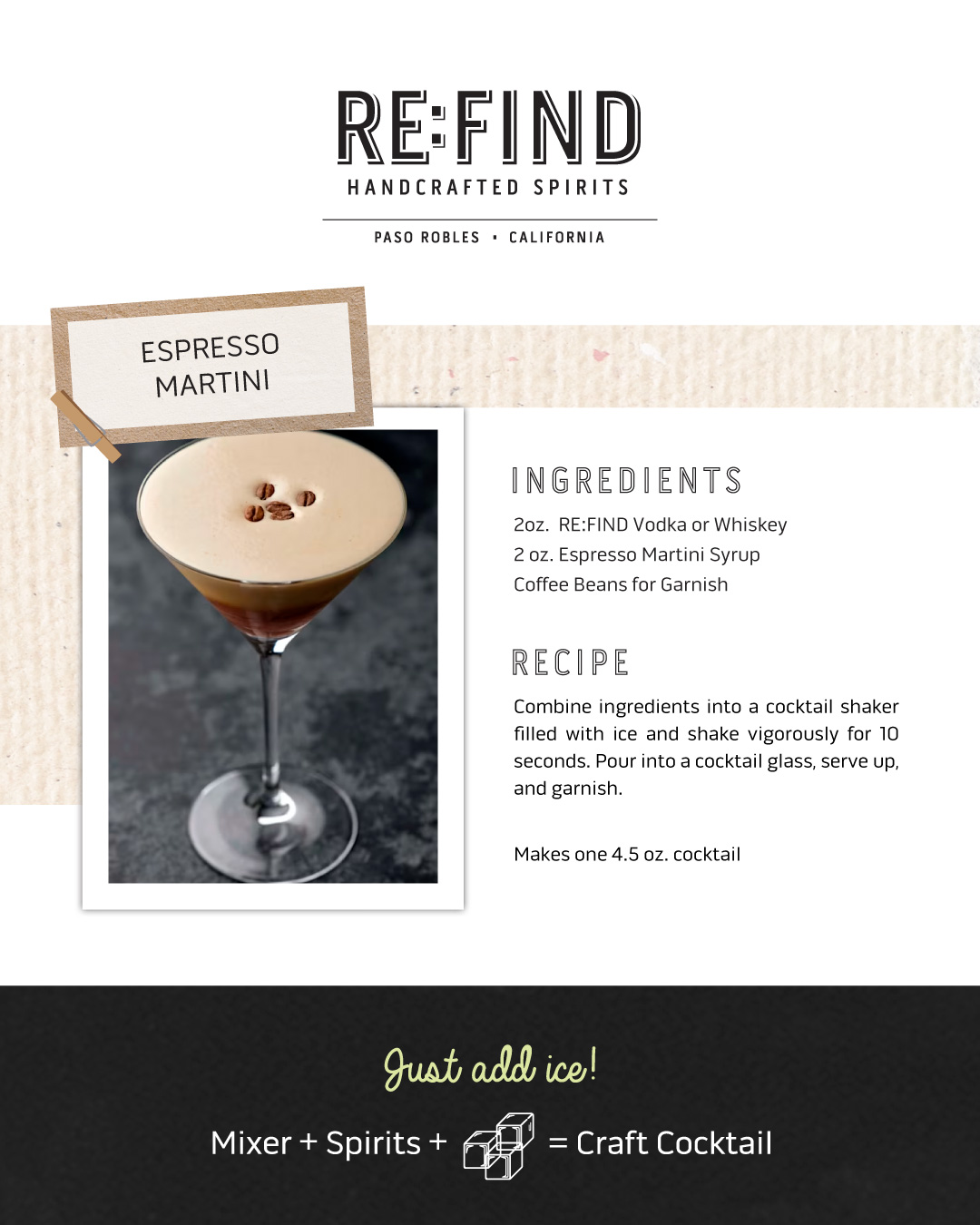 Includes: 1 - Your Choice of Re:Find Spirit (750ml) 1 - Espresso Martini Syrup (17oz.)1 - Coffee Garnish Pack1 - Recipe Card